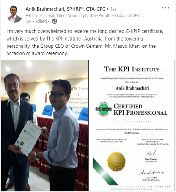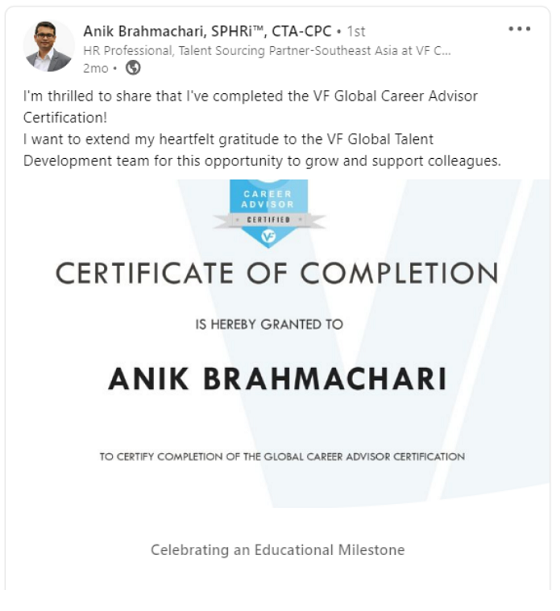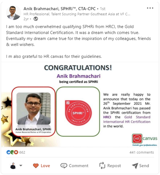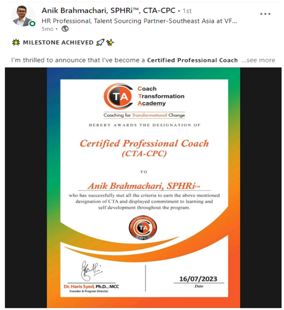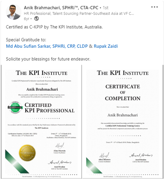 He is a globally recognized Senior Professional in Human Resources having International™ certifications such as (SPHRi™), HRCI, USA, Certified Professional Coach (CTA-CPC) by Coach Transformation Academy, Certified KPI Professional by The KPI Institute, Australia, Certified Learning & Development Professional by Aon Hewitt Learning Center, India, and Certified Total Rewards Professional by ATRI (ASEAN Total Rewards Institute), Singapore.